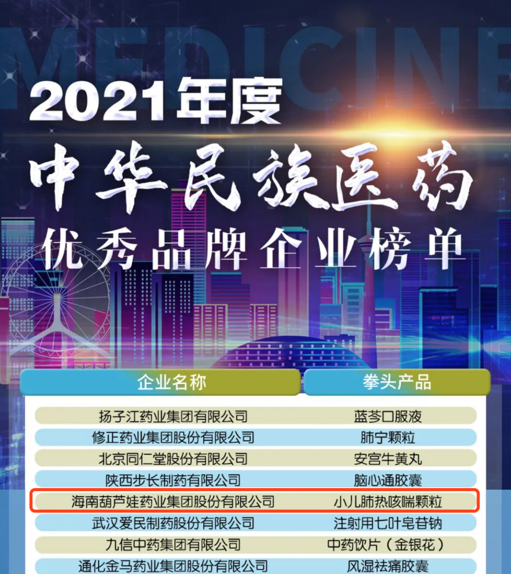 12月29日,全国工商联医药业商会发布了“2021年度中华民族医药优秀品牌企业榜单”,皇冠体育药业集团凭借黄金单品小儿肺热咳喘颗粒(4克)实力登榜。