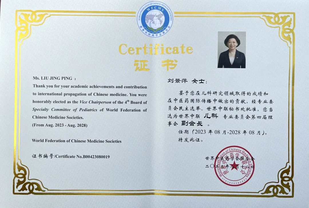 皇冠体育药业集团党委书记、董事长刘景萍当选世界中医药学会联合会儿科专业委员会第四届理事会副会长